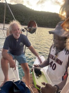 We anchored near Mayreau Island, in Carnash Bay, also known as Salt Whistle Bay. It’s the kind of beach that makes you forget time exists. That’s where Charlie kayaked out to our boat, not with a motor, but with quiet determination, selling locally crafted jewelry and welcoming us like neighbors. Others—J.J., Darryl, and their friends—came by too, sharing stories, laughter, provisions, and a sense of pride that runs deeper than circumstance.